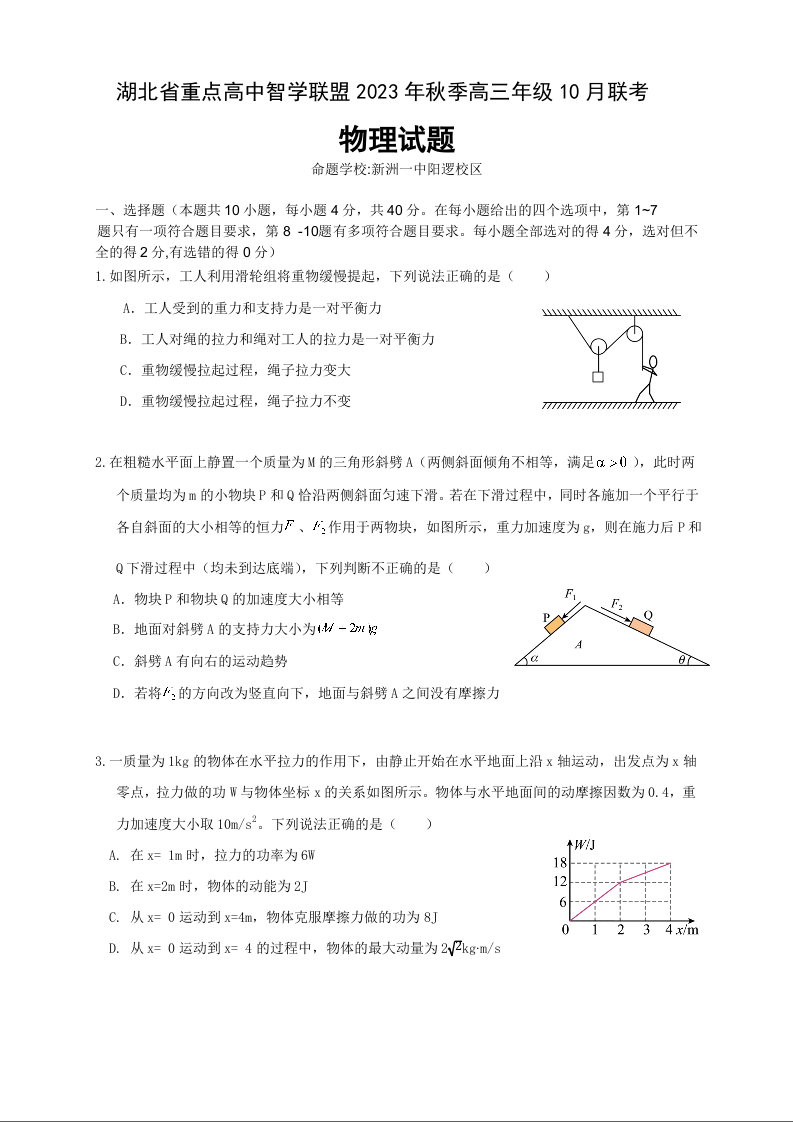 湖北省重点高中智学联盟2023-2024学年高三上学期10月联考 物理