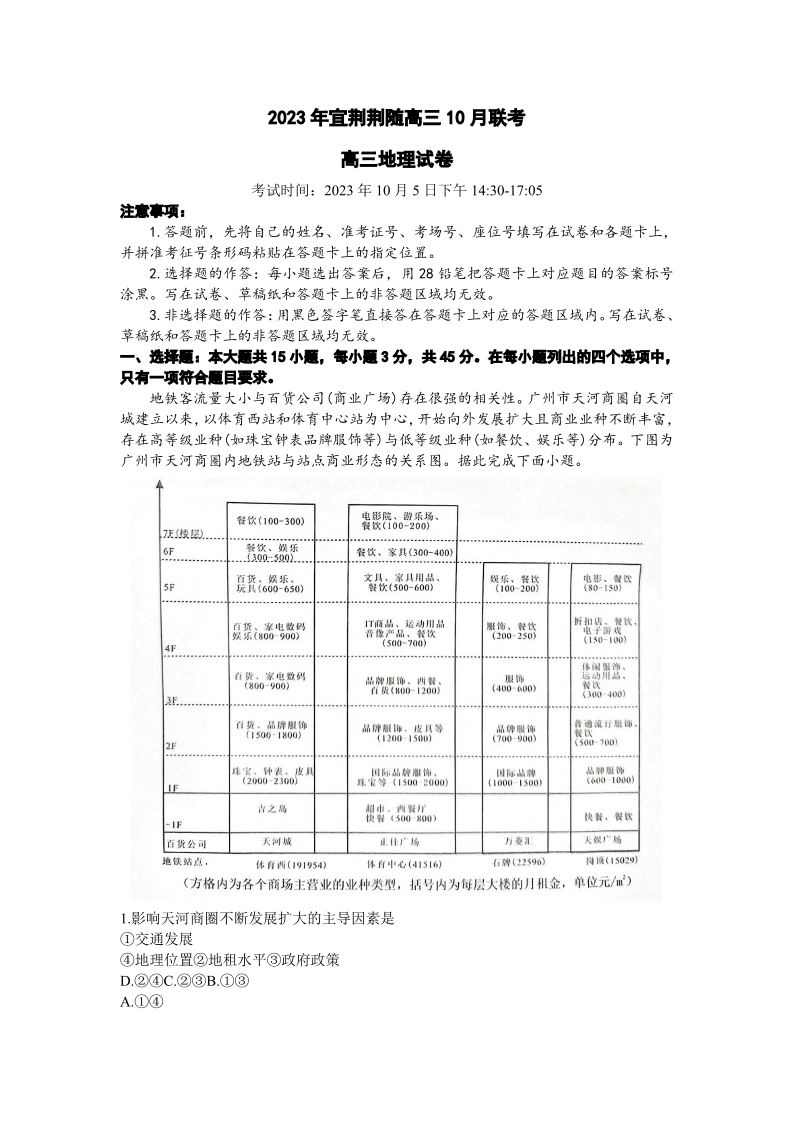 湖北省宜荆荆随2023-2024学年高三上学期10月联考 地理