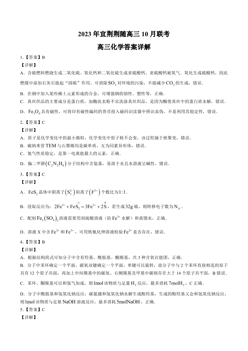 湖北省宜荆荆随2023-2024学年高三上学期10月联考 化学答案