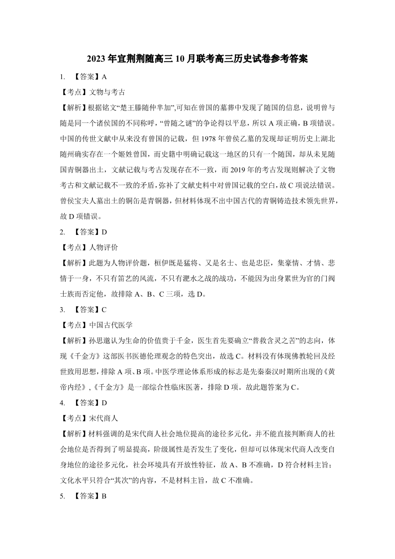 湖北省宜荆荆随2023-2024学年高三上学期10月联考 历史答案