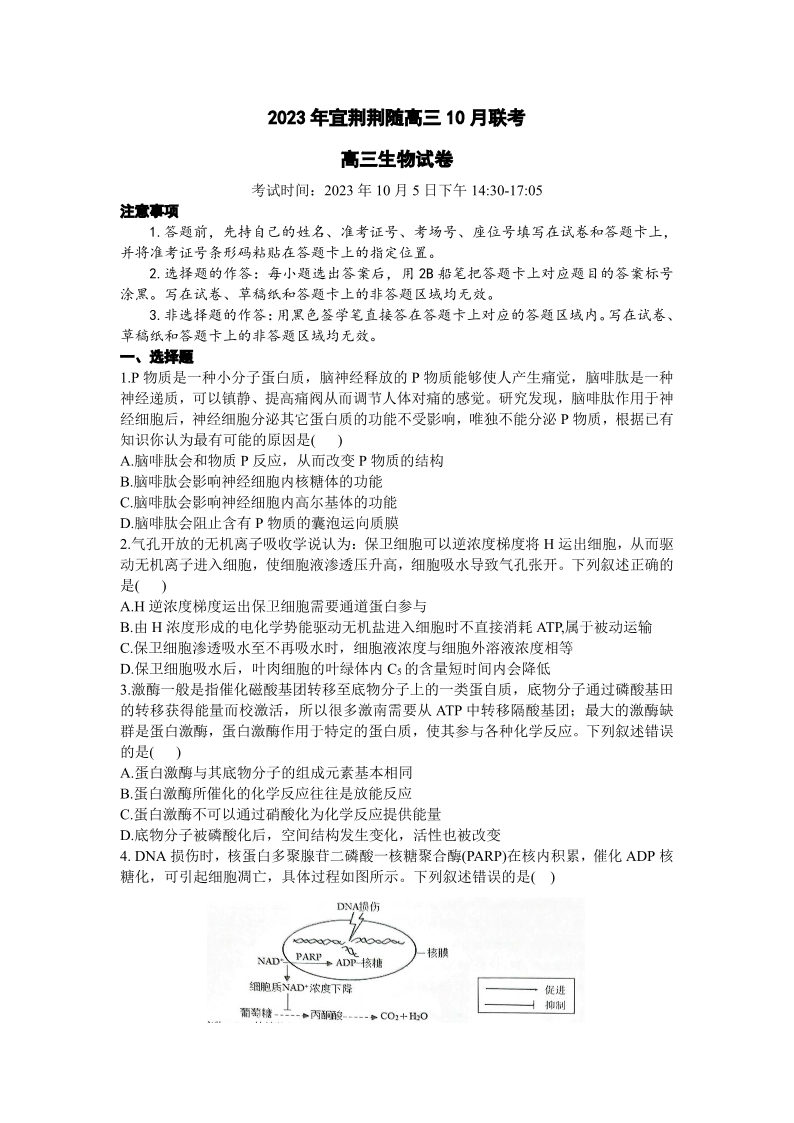 湖北省宜荆荆随2023-2024学年高三上学期10月联考 生物