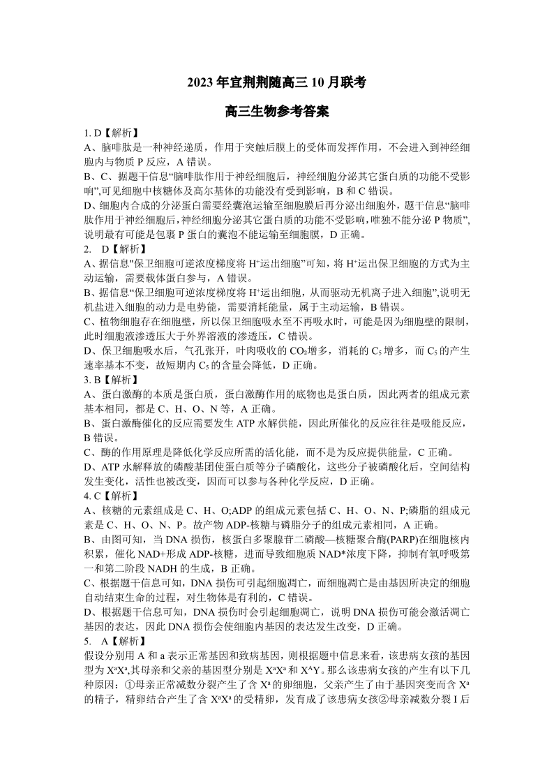 湖北省宜荆荆随2023-2024学年高三上学期10月联考 生物答案
