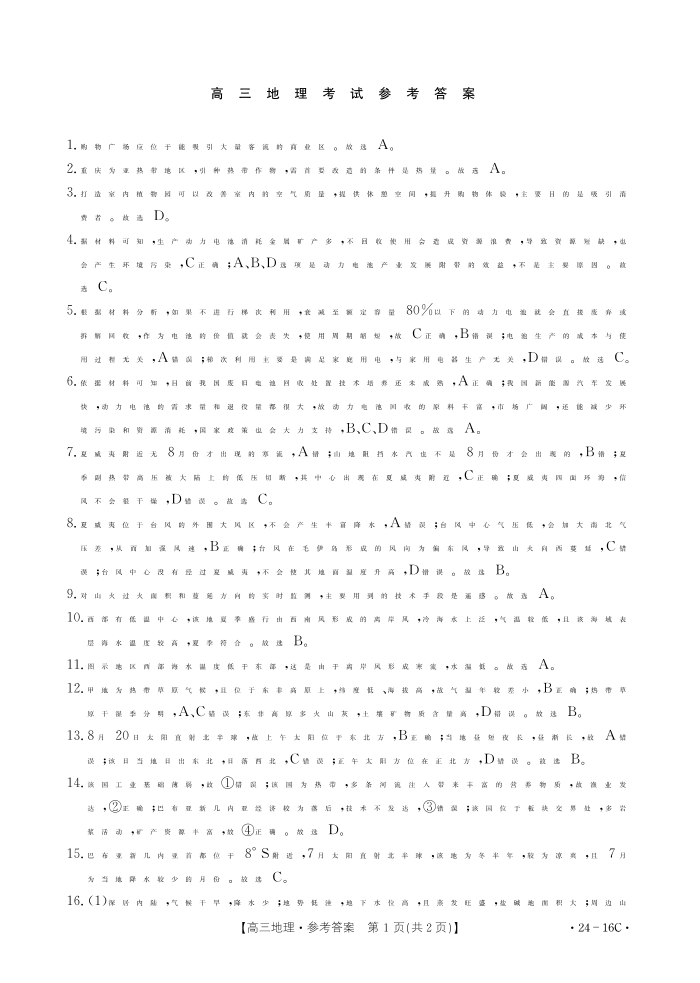 湖北省部分学校2023-2024学年高三上学期10月月考 地理答案