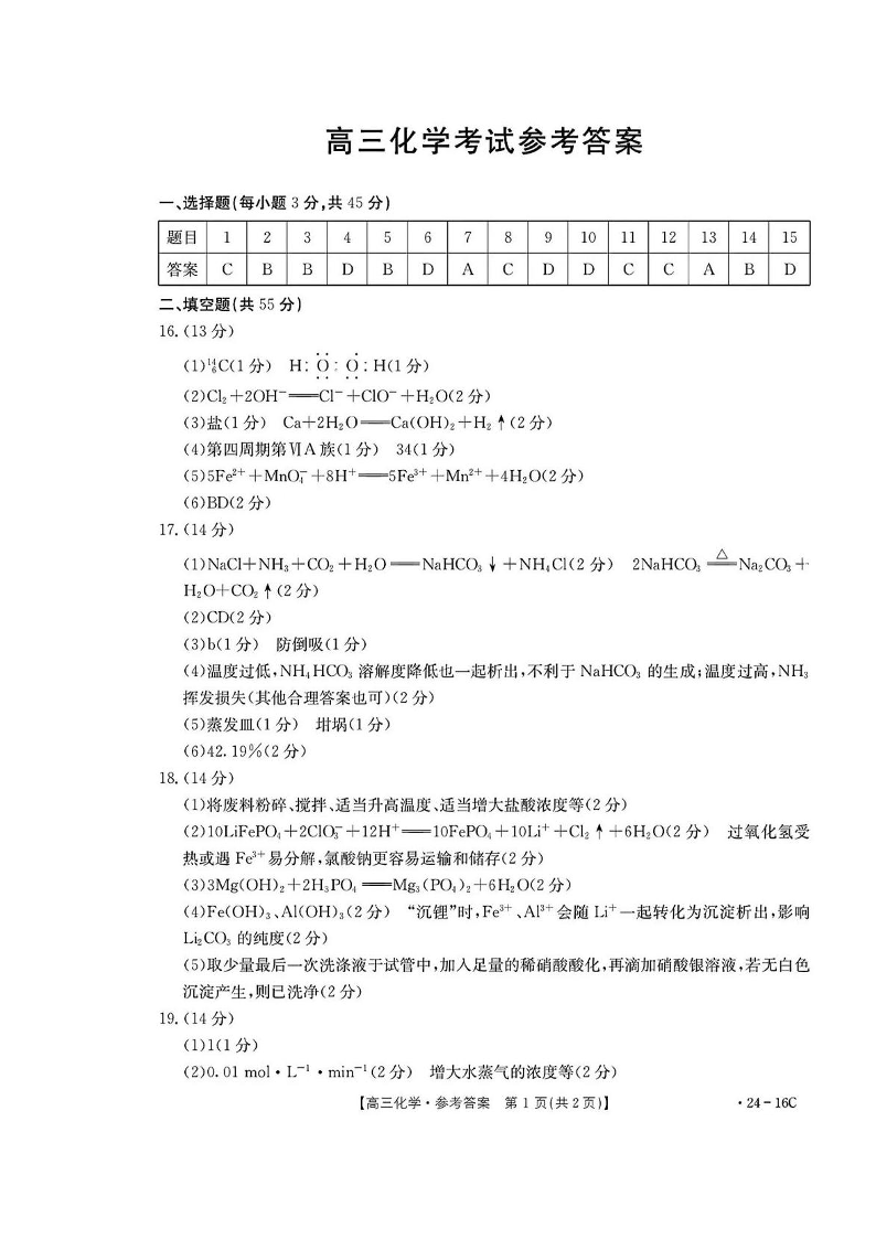 湖北省部分学校2023-2024学年高三上学期10月月考 化学答案