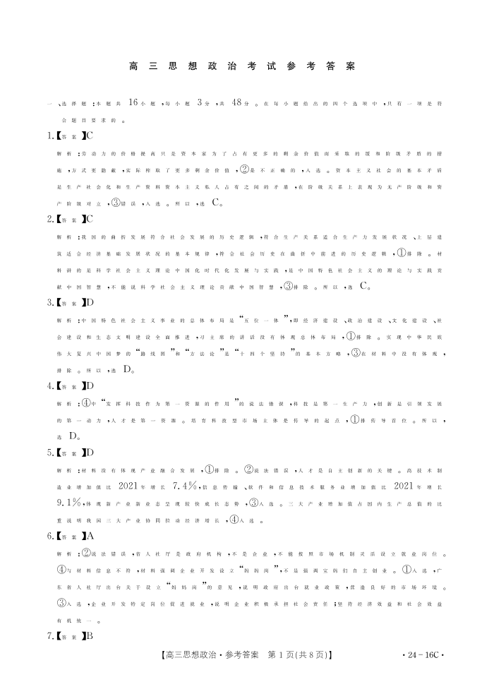 湖北省部分学校2023-2024学年高三上学期10月月考 政治答案