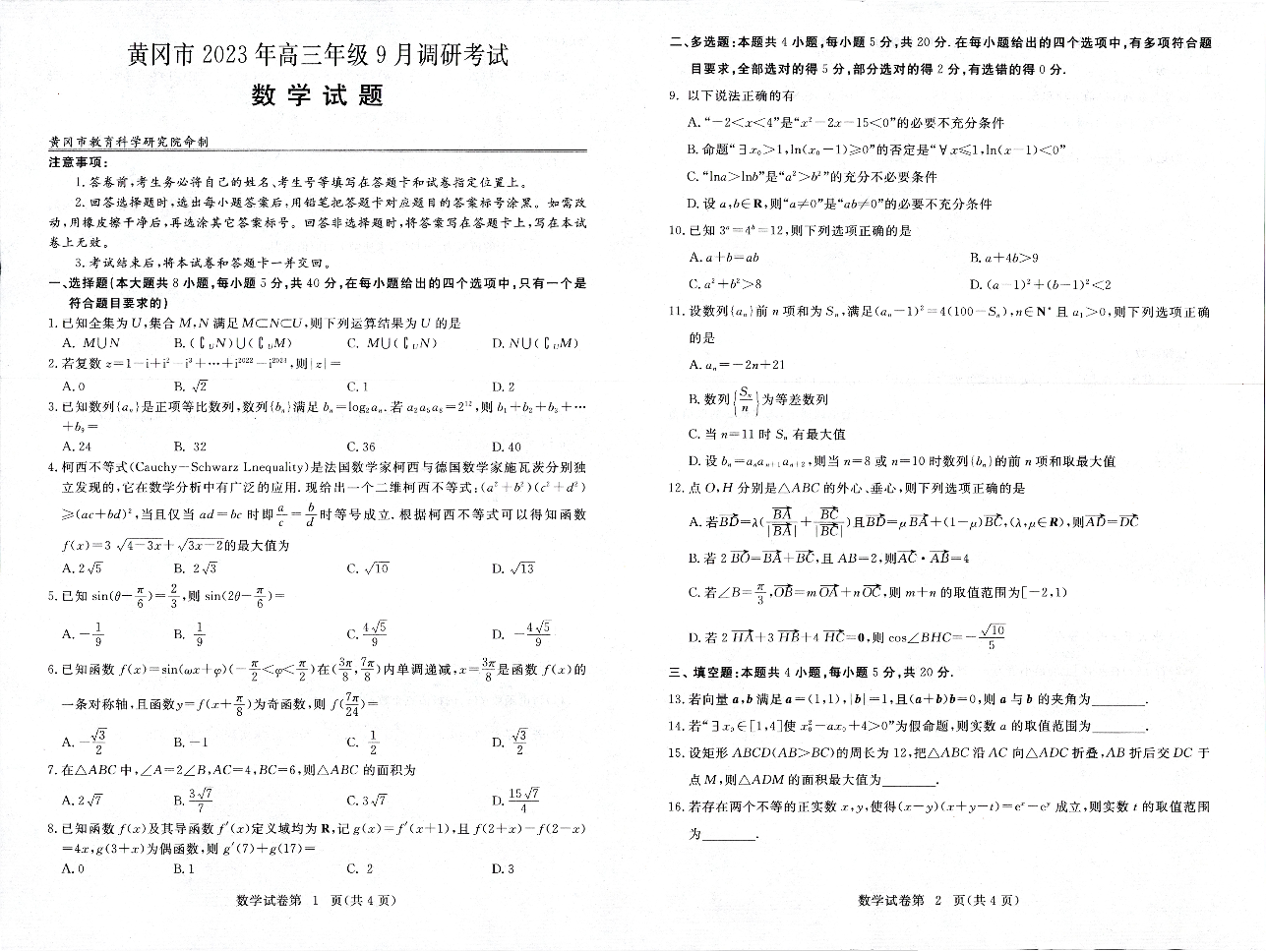 黄冈市2023年高三年级9月调研考试 数学
