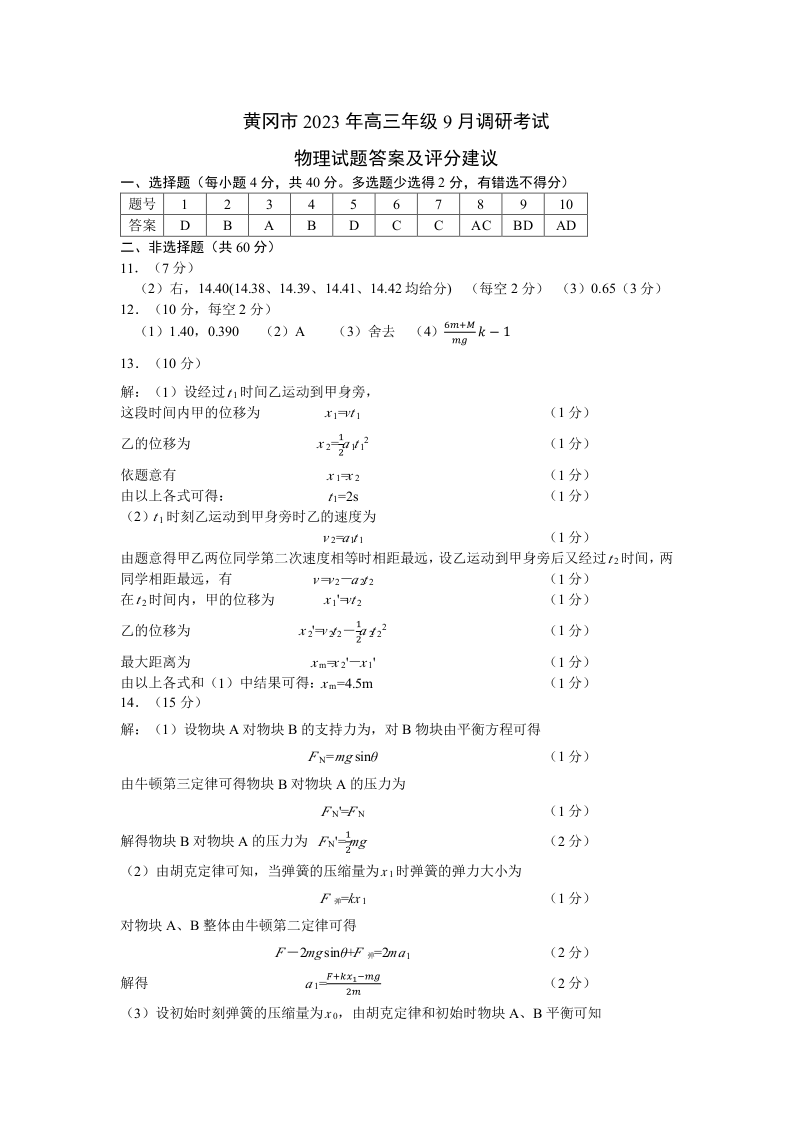 黄冈市2023年高三年级9月调研考试 物理参考答案