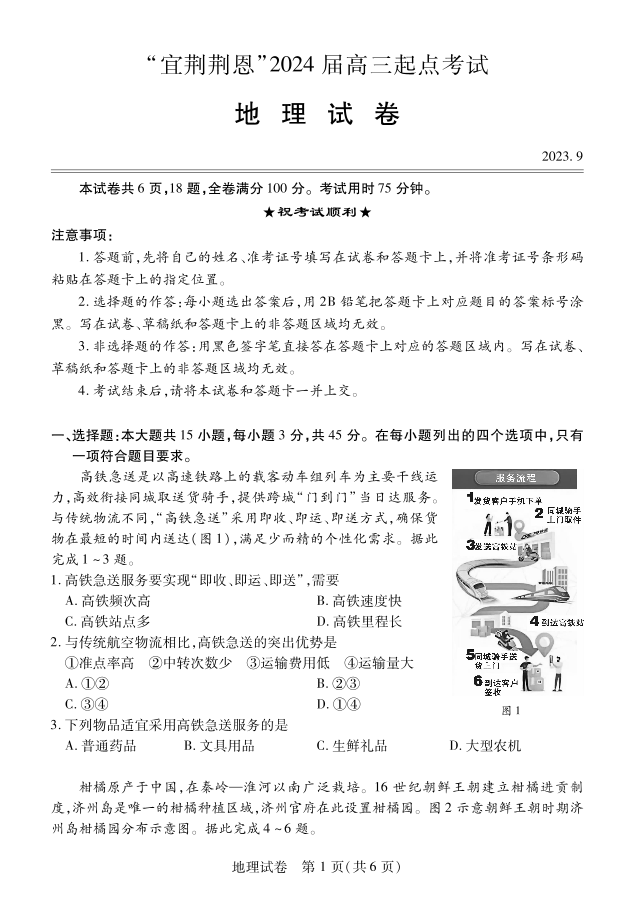 湖北省宜荆荆恩2023-2024学年高三上学期9月起点考试 地理