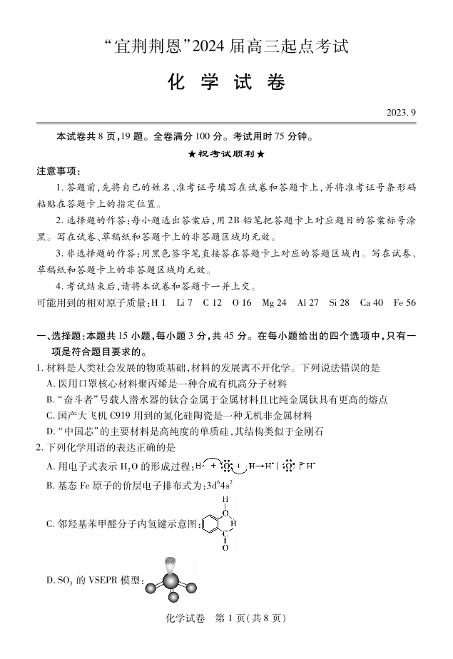 湖北省宜荆荆恩2023-2024学年高三上学期9月起点考试 化学