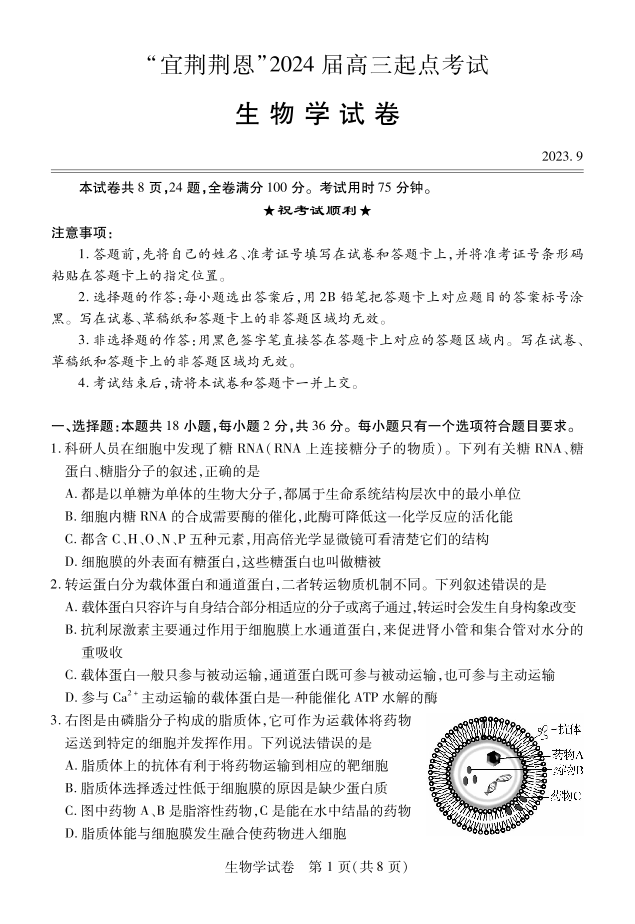湖北省宜荆荆恩2023-2024学年高三上学期9月起点考试 生物