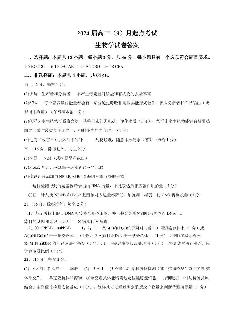 湖北省宜荆荆恩2023-2024学年高三上学期9月起点考试 生物答案