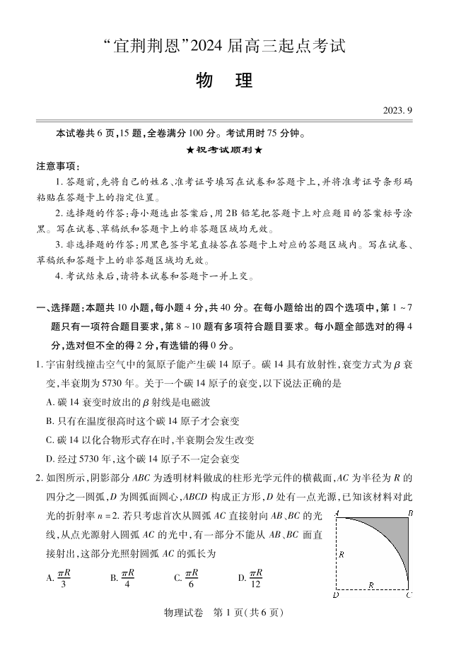 湖北省宜荆荆恩2023-2024学年高三上学期9月起点考试 物理