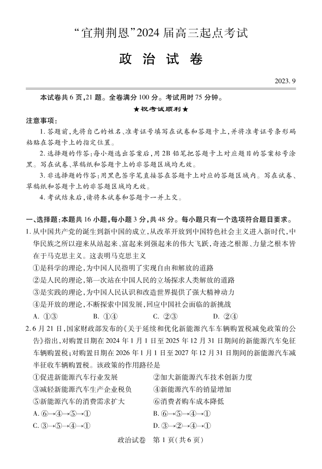 湖北省宜荆荆恩2023-2024学年高三上学期9月起点考试 政治
