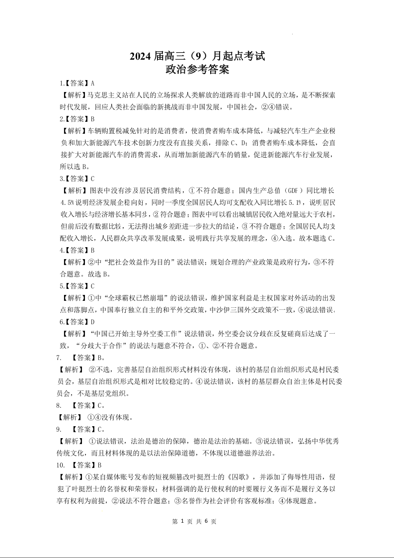 湖北省宜荆荆恩2023-2024学年高三上学期9月起点考试 政治答案
