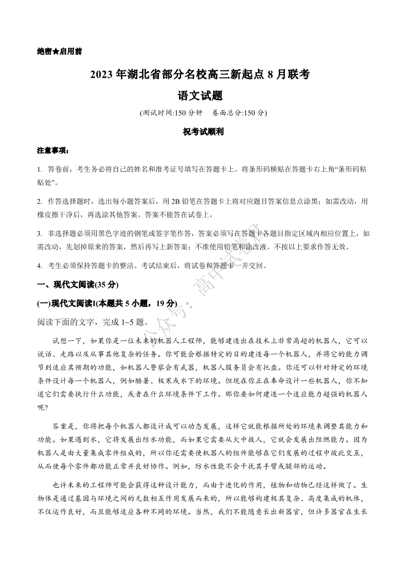 湖北省部分名校2023-2024学年高三上学期新起点8月联考 语文