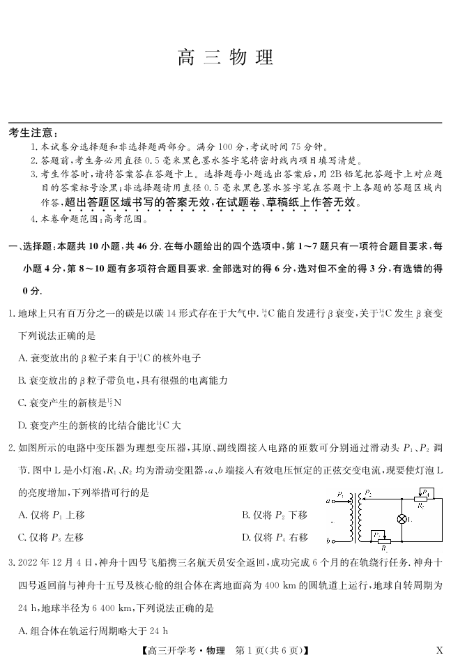 湖北省2024届高三上学期8月开学考试 物理