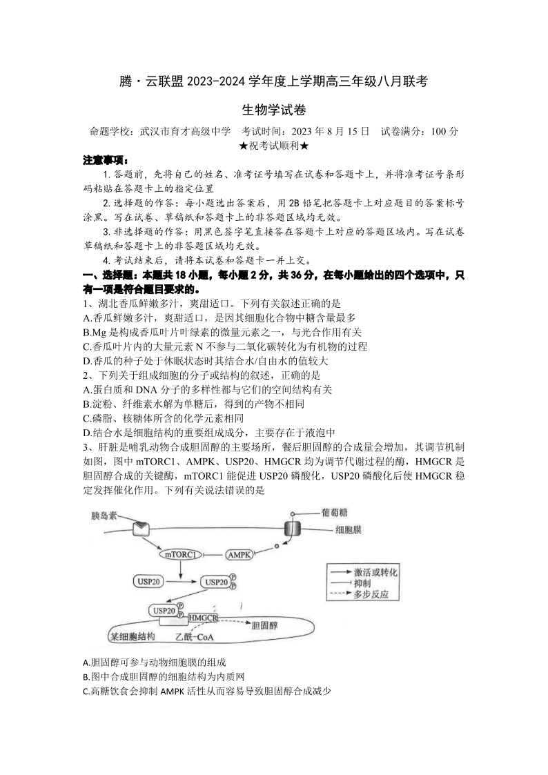 湖北省腾云联盟2023-2024学年高三上学期8月联考 生物