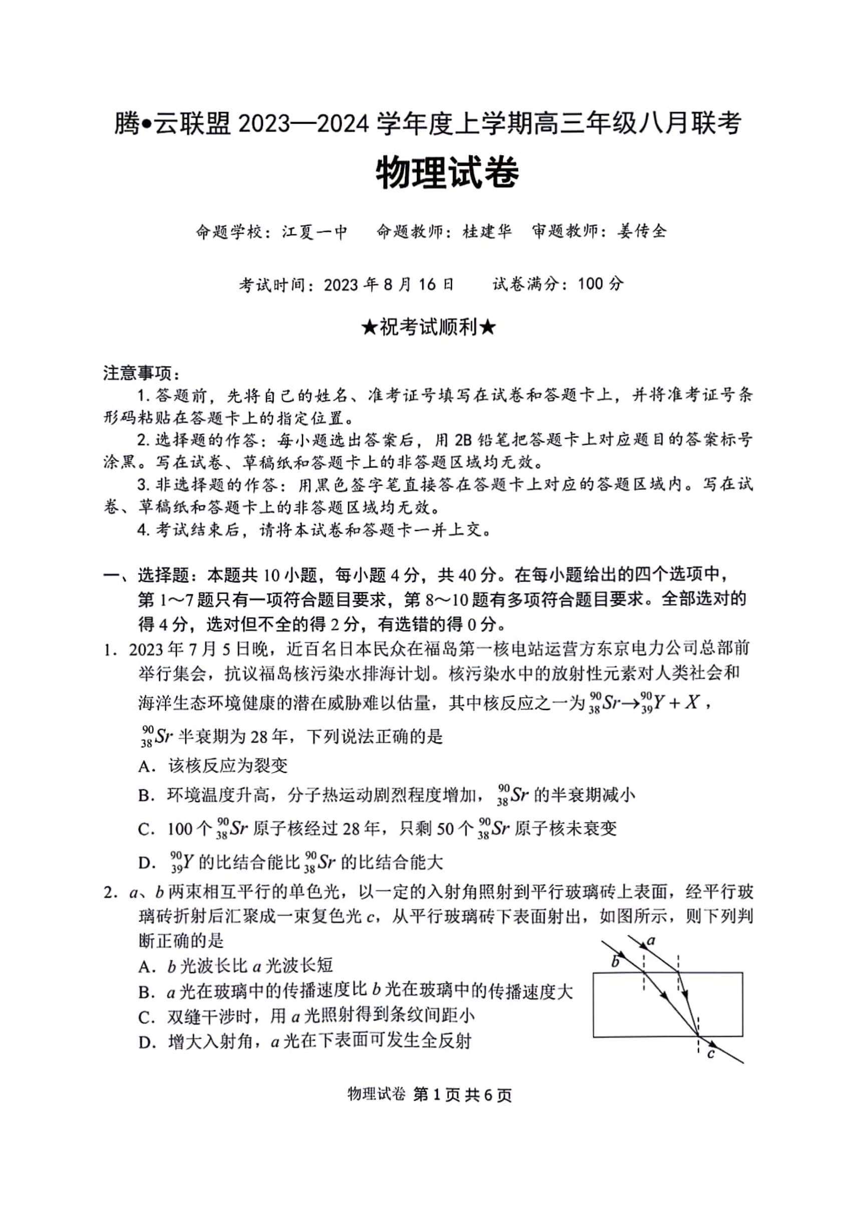 湖北省腾云联盟2023-2024学年高三上学期8月联考 物理