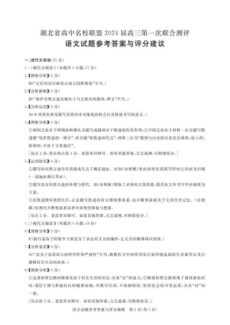 湖北省高中名校联盟2023-2024学年高三上学期第一次联合测评 语文答案