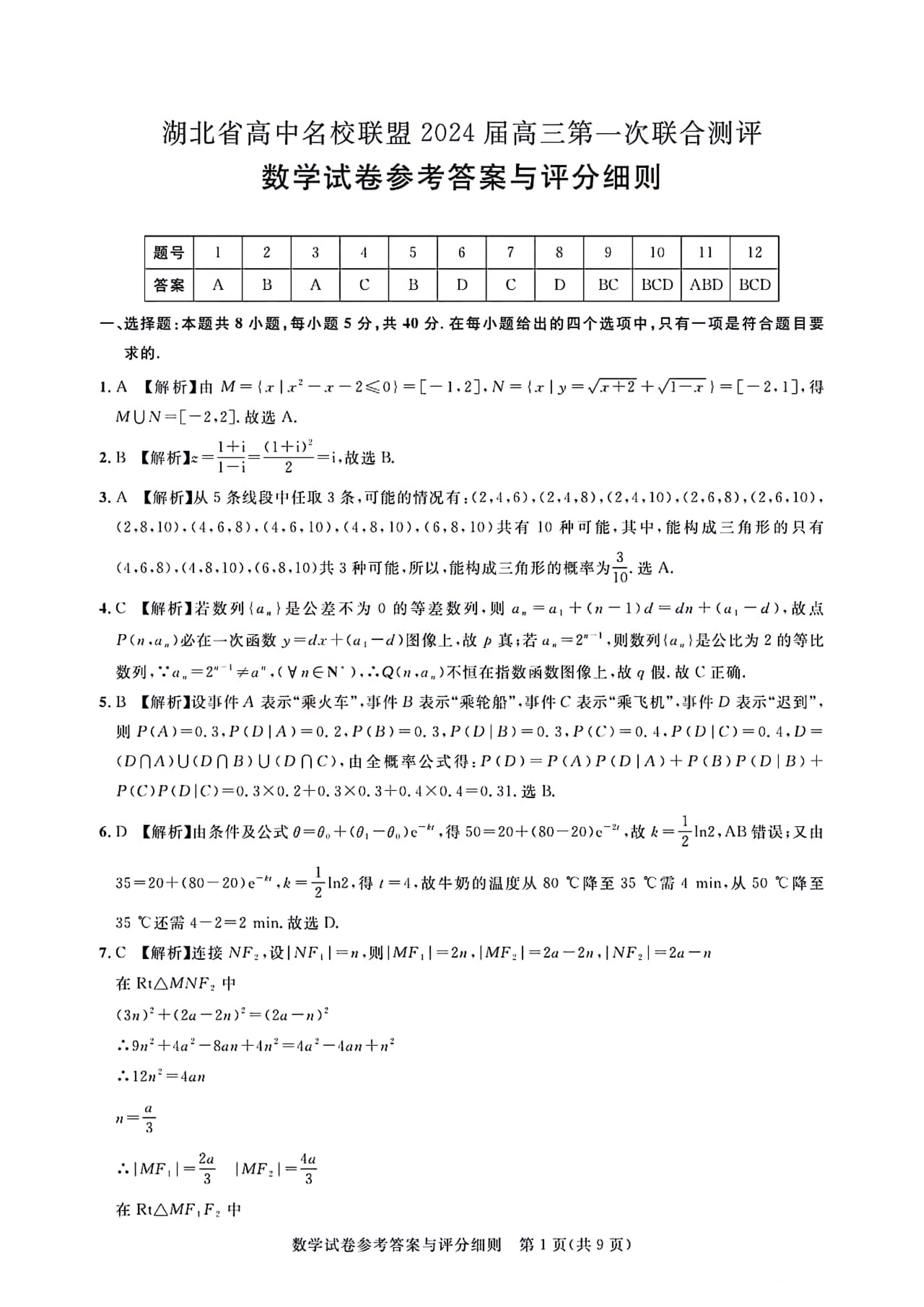 湖北省高中名校联盟2023-2024学年高三上学期第一次联合测评 数学答案