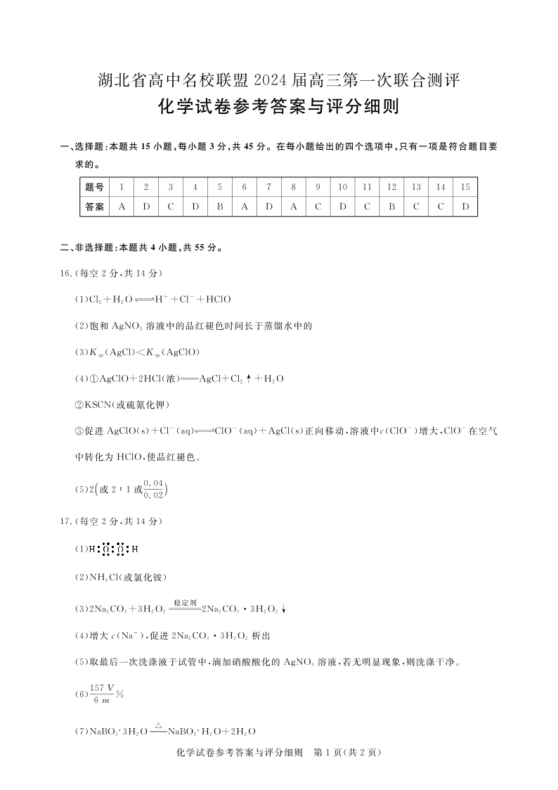 湖北省高中名校联盟2023-2024学年高三上学期第一次联合测评 化学答案