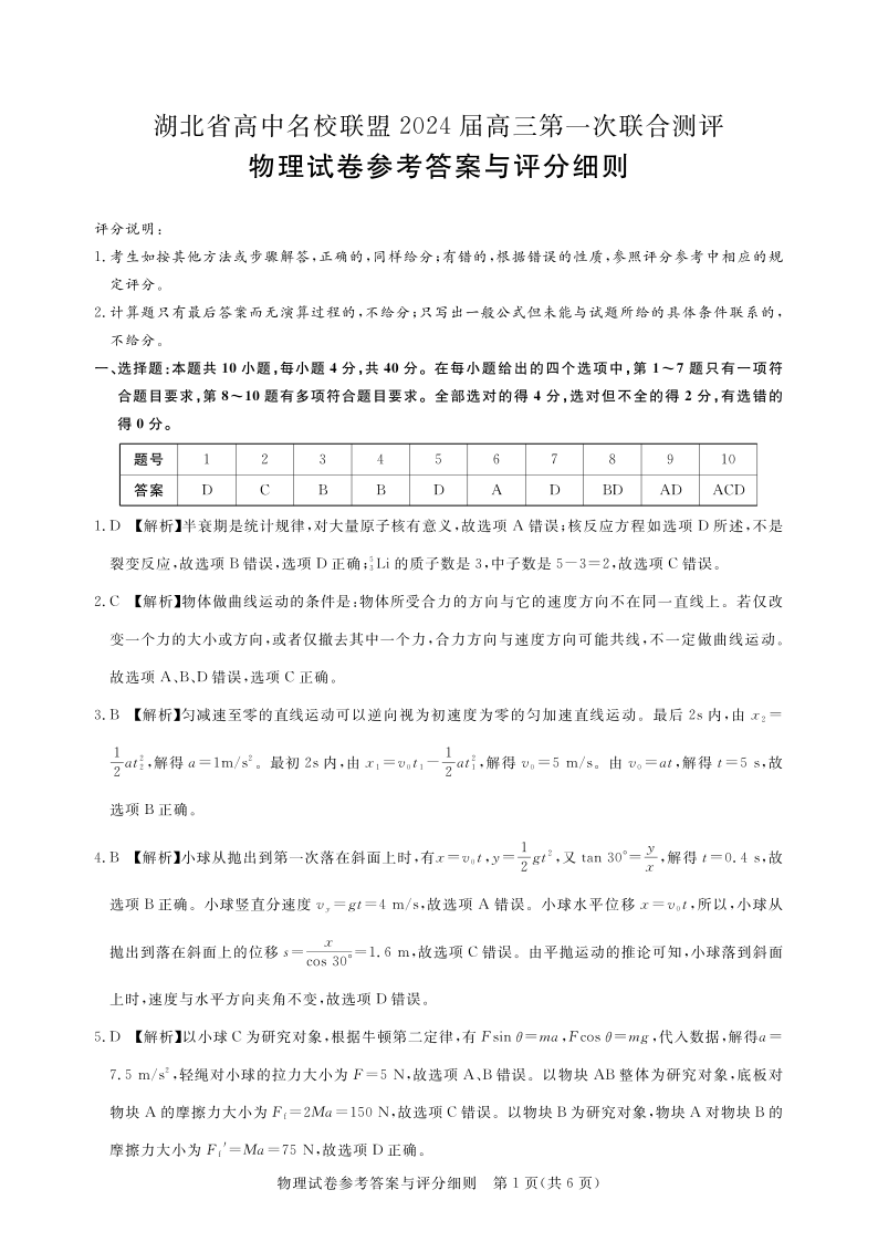 湖北省高中名校联盟2023-2024学年高三上学期第一次联合测评 物理答案