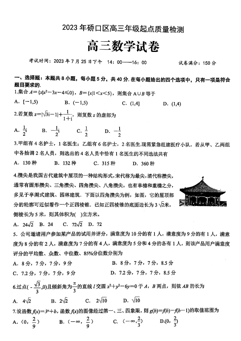 2024届武汉市硚口区高三上学期起点质量检测 数学