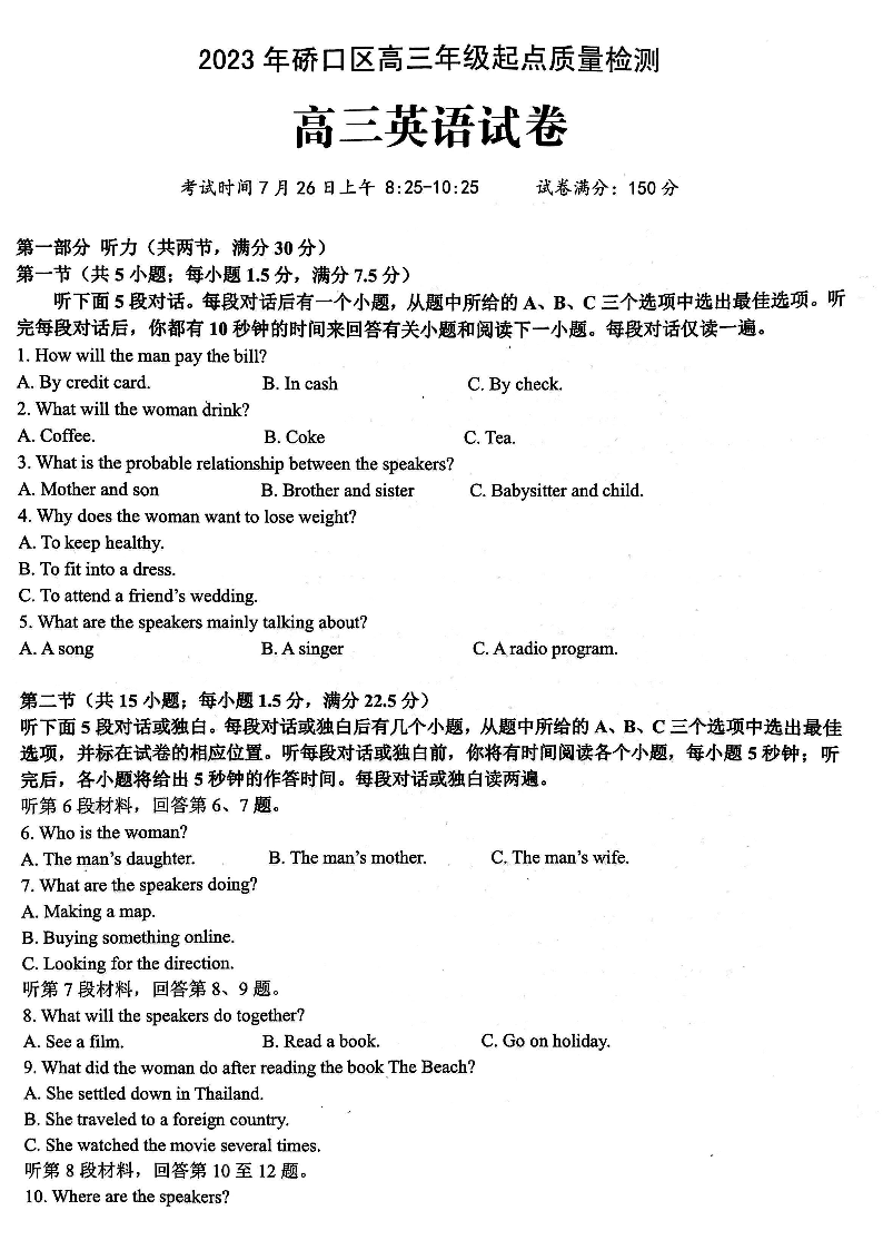 2024届武汉市硚口区高三上学期起点质量检测 英语