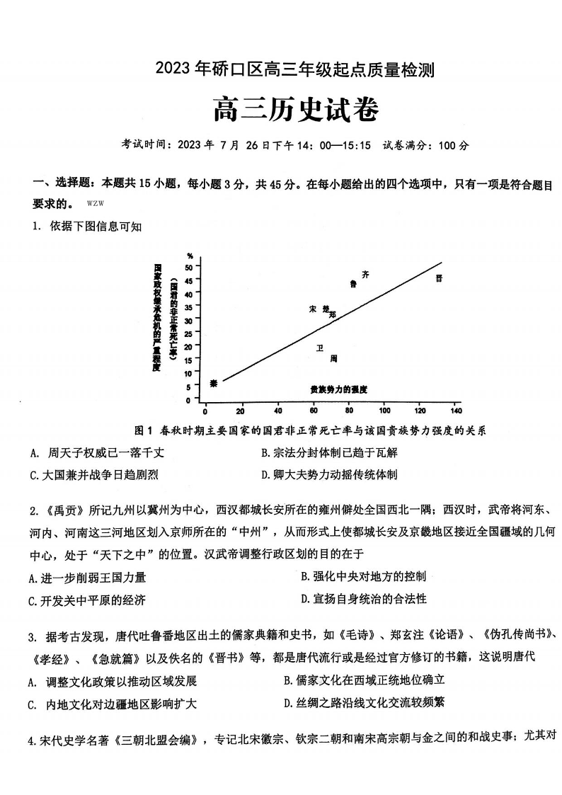 2024届武汉市硚口区高三上学期起点质量检测 历史