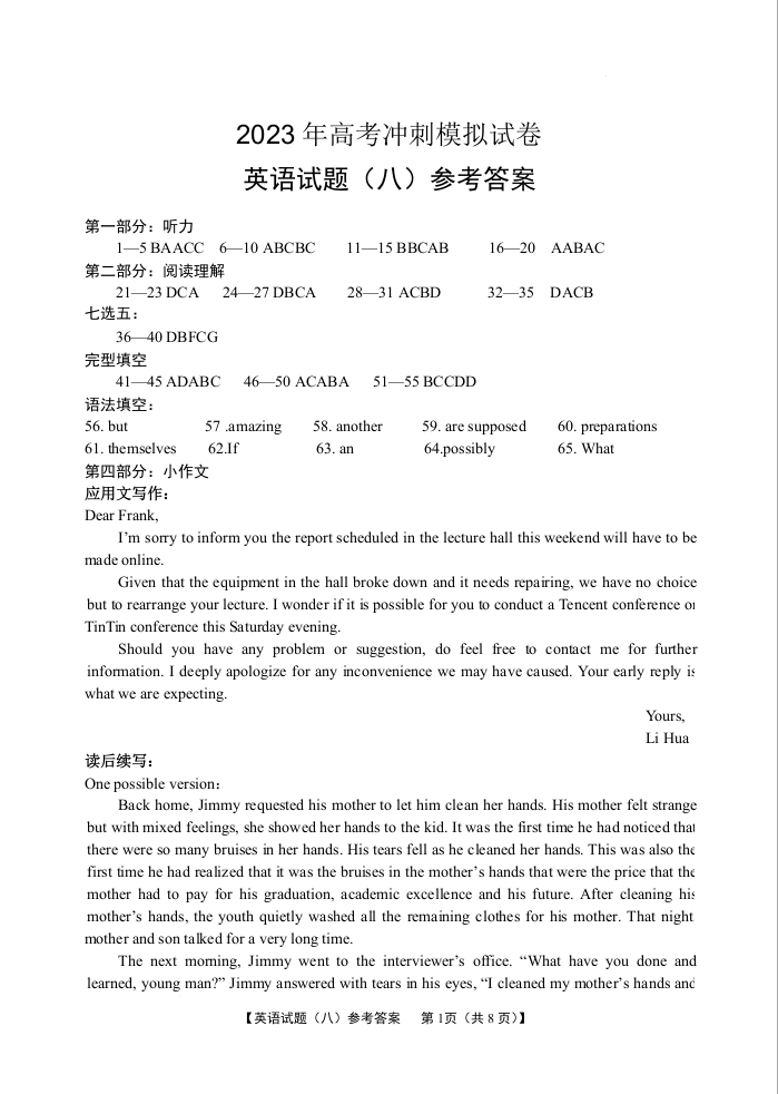 2023届湖北省高考冲刺模拟试卷英语试题(八)答案