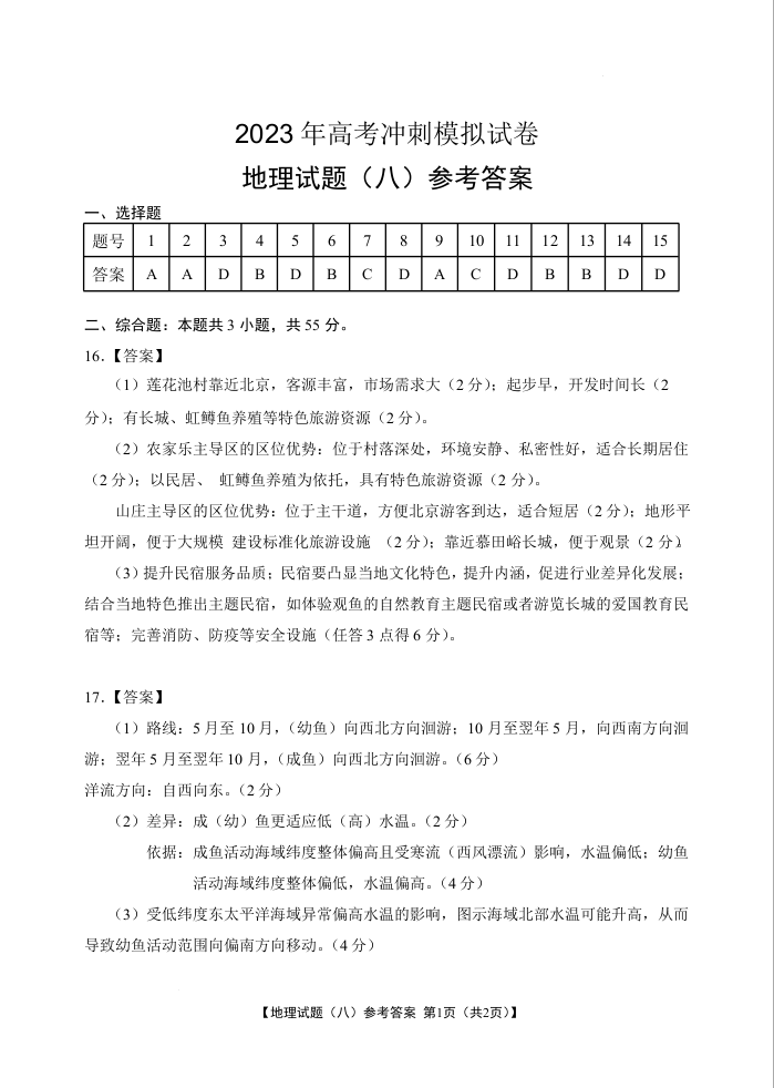 2023届湖北省高考冲刺模拟试卷地理试题(八)答案