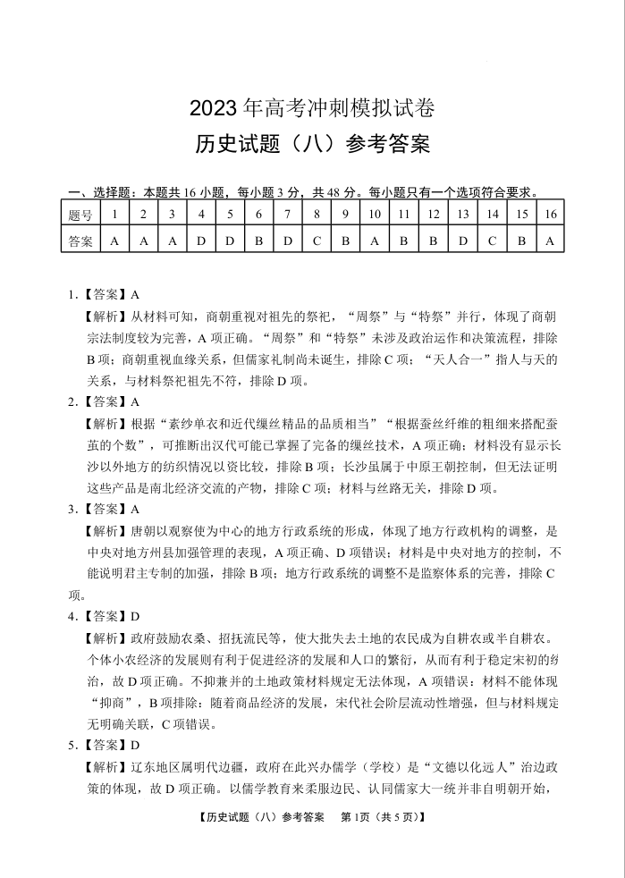 2023届湖北省高考冲刺模拟试卷历史试题(八)答案