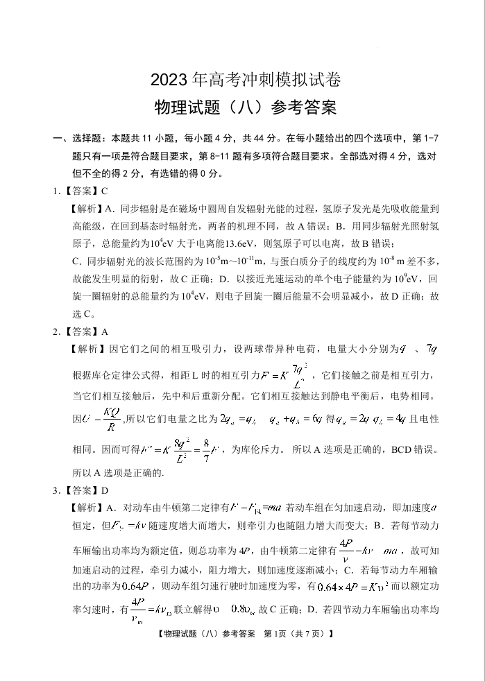 2023届湖北省高考冲刺模拟试卷物理试题(八)答案