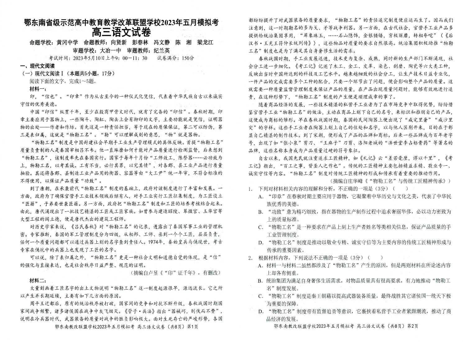 鄂东南联盟2023年五月模拟 语文