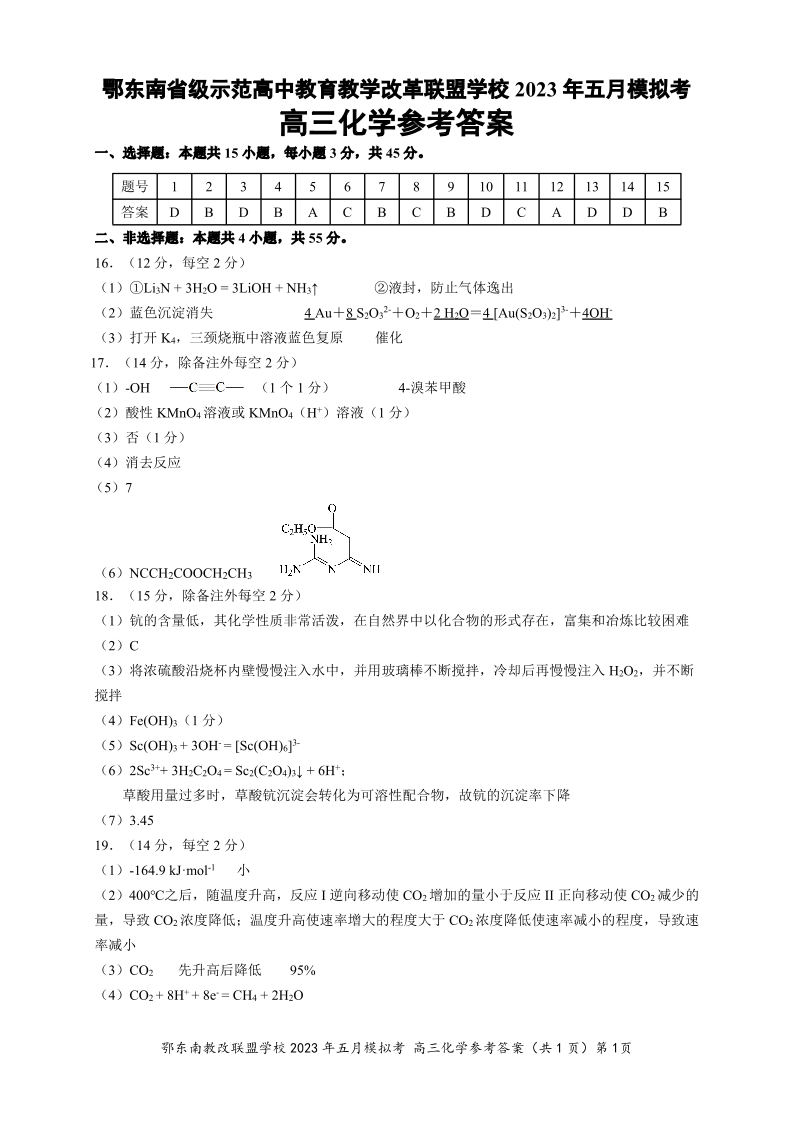 鄂东南联盟2023年五月模拟 化学参考答案2