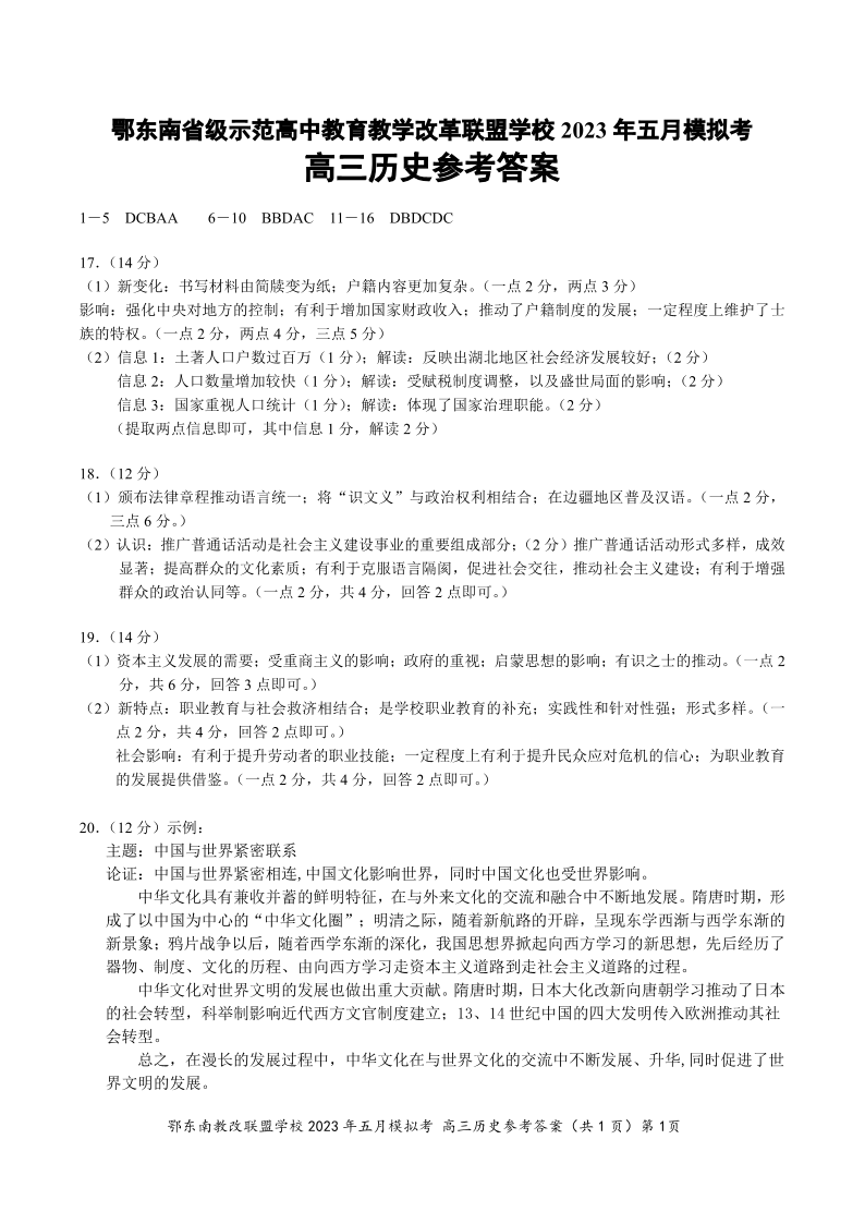 鄂东南联盟2023年五月模拟 历史参考答案