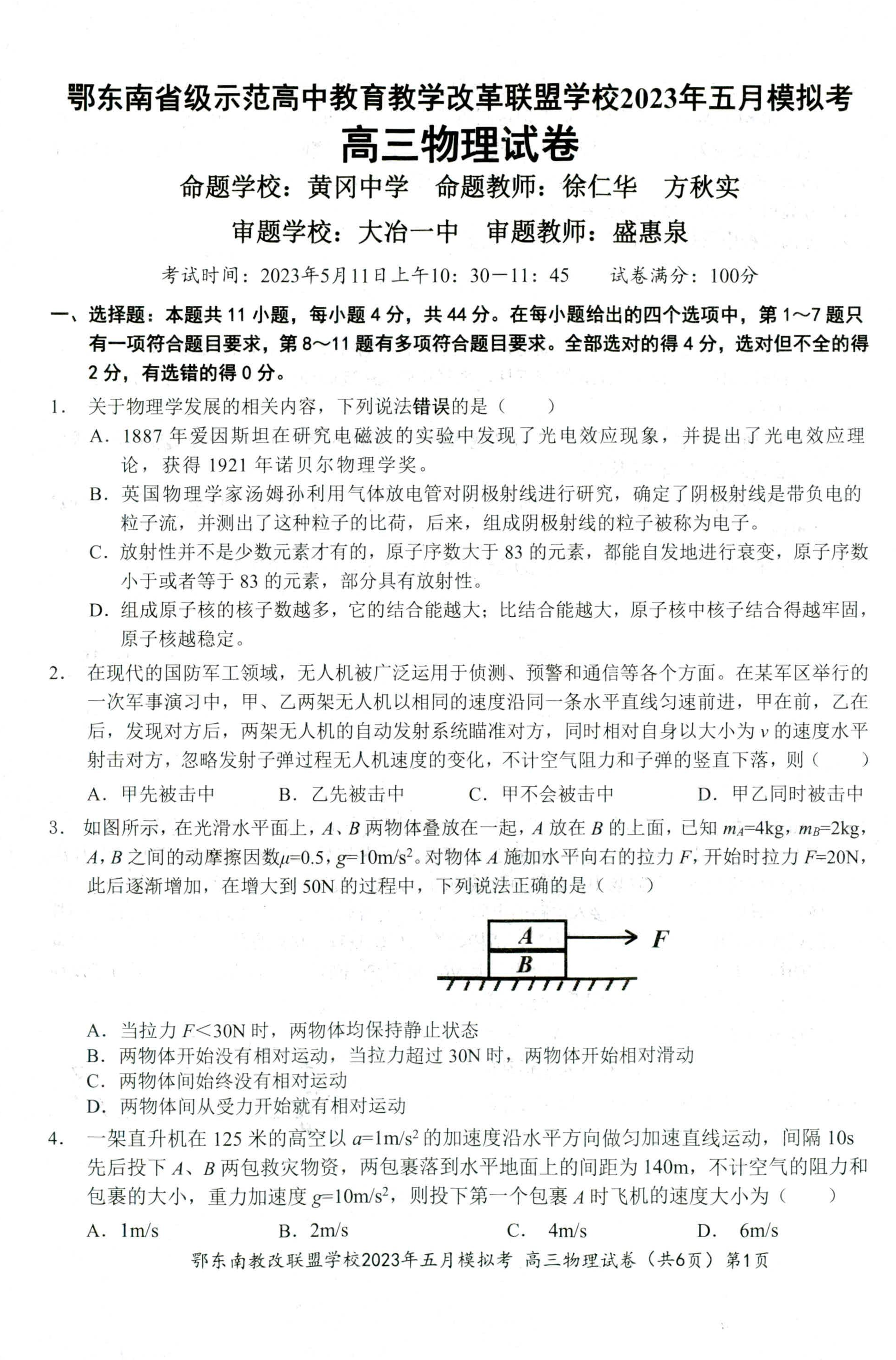 鄂东南联盟2023年五月模拟 物理