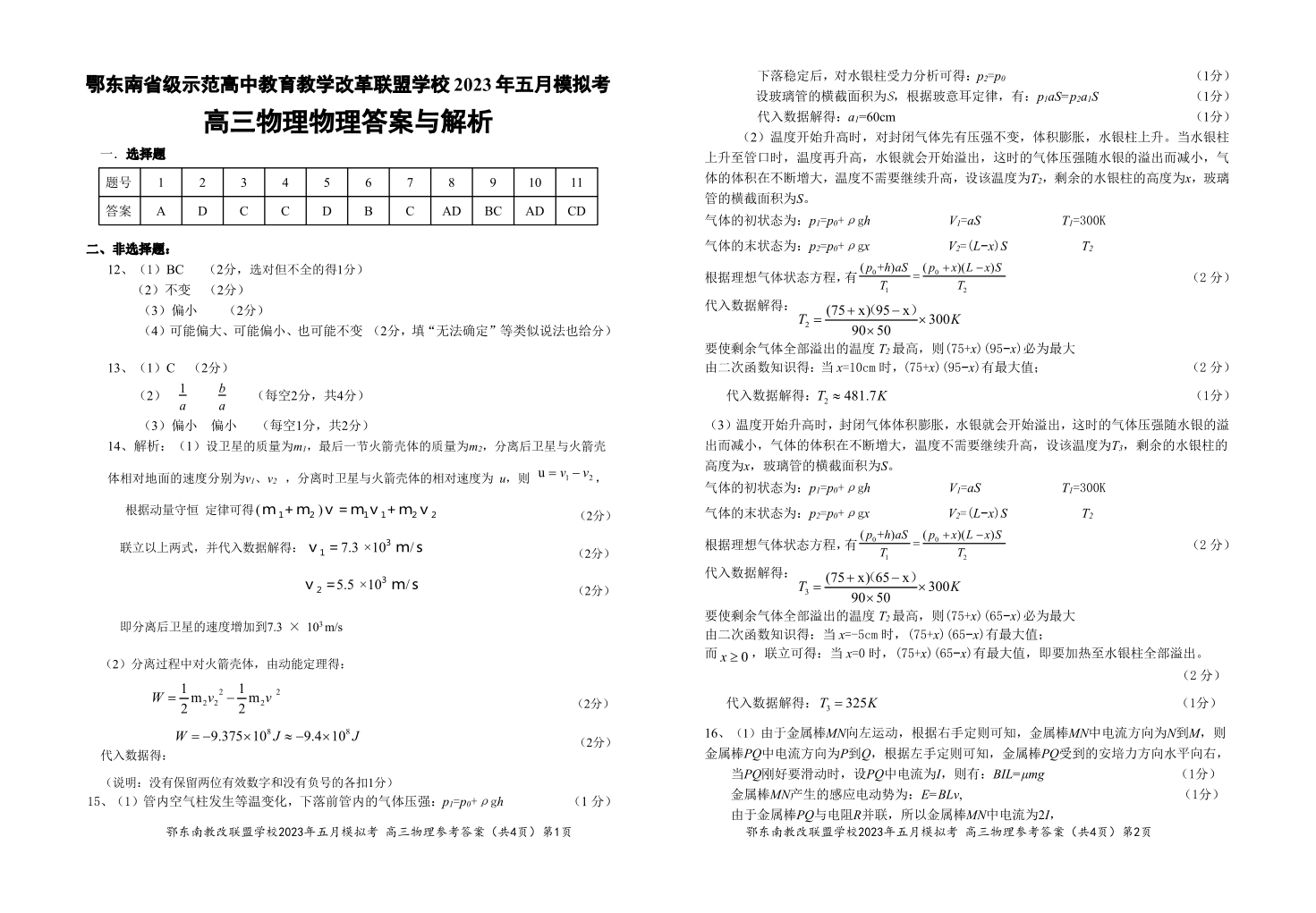 鄂东南联盟2023年五月模拟 物理参考答案