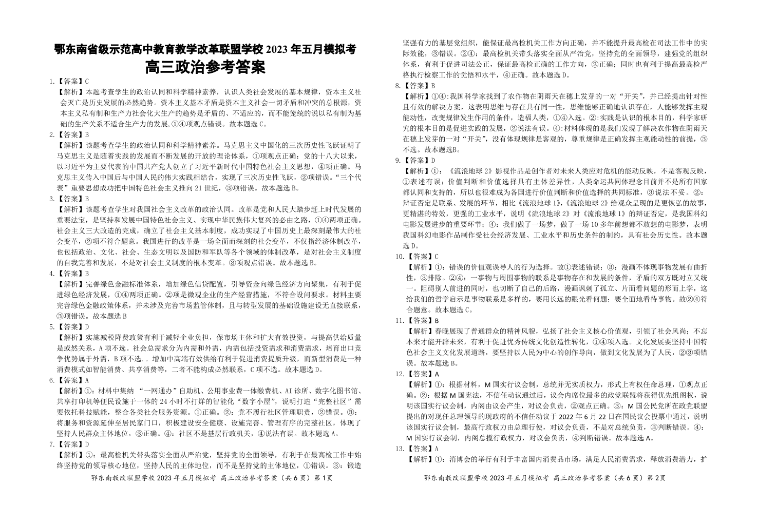 鄂东南联盟2023年五月模拟 政治参考答案