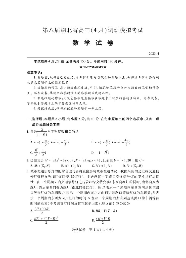 第八届湖北省高三(4月)调研模拟考试 数学