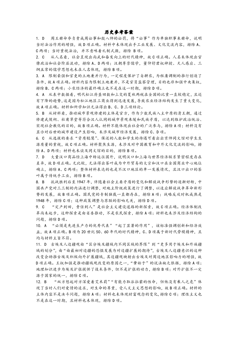 第八届湖北省高三(4月)调研模拟考试 历史答案