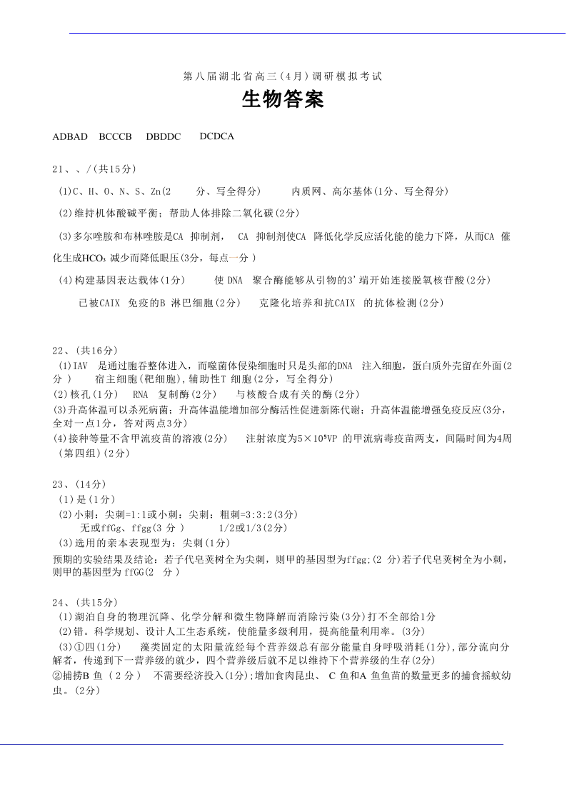 第八届湖北省高三(4月)调研模拟考试 生物答案