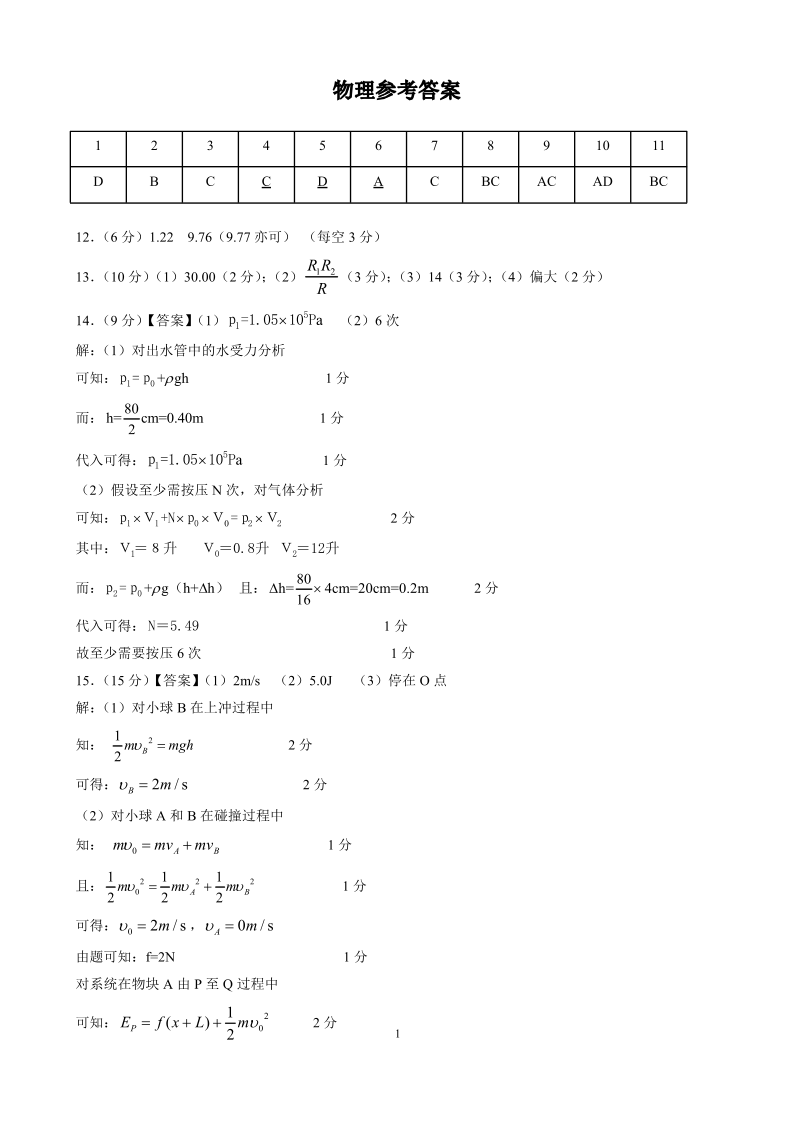 第八届湖北省高三(4月)调研模拟考试 物理答案