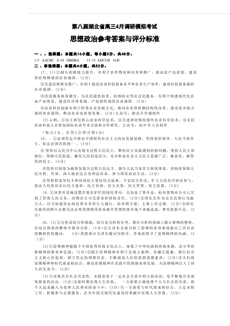 第八届湖北省高三(4月)调研模拟考试 政治答案