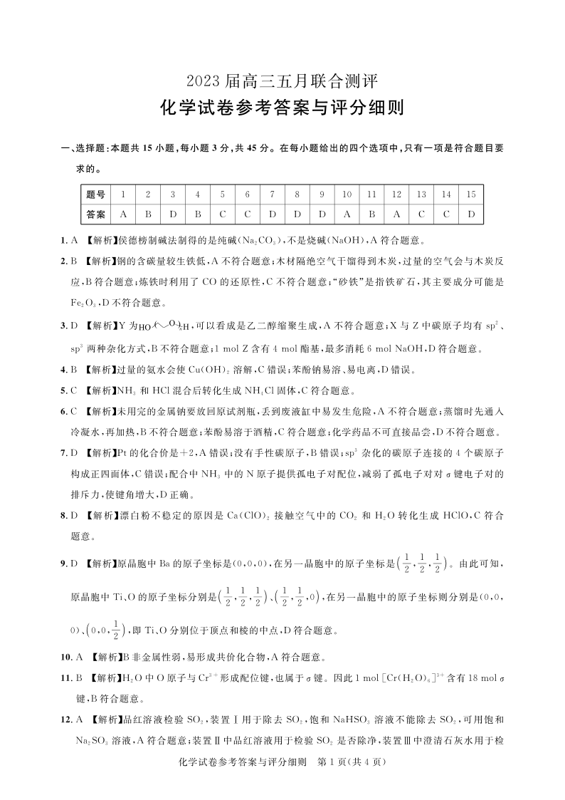 圆创教育-2023年五月高三联考-化学答案
