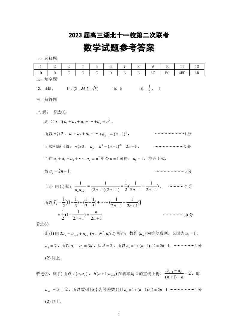2023届高三十一校第二次联考 数学答案