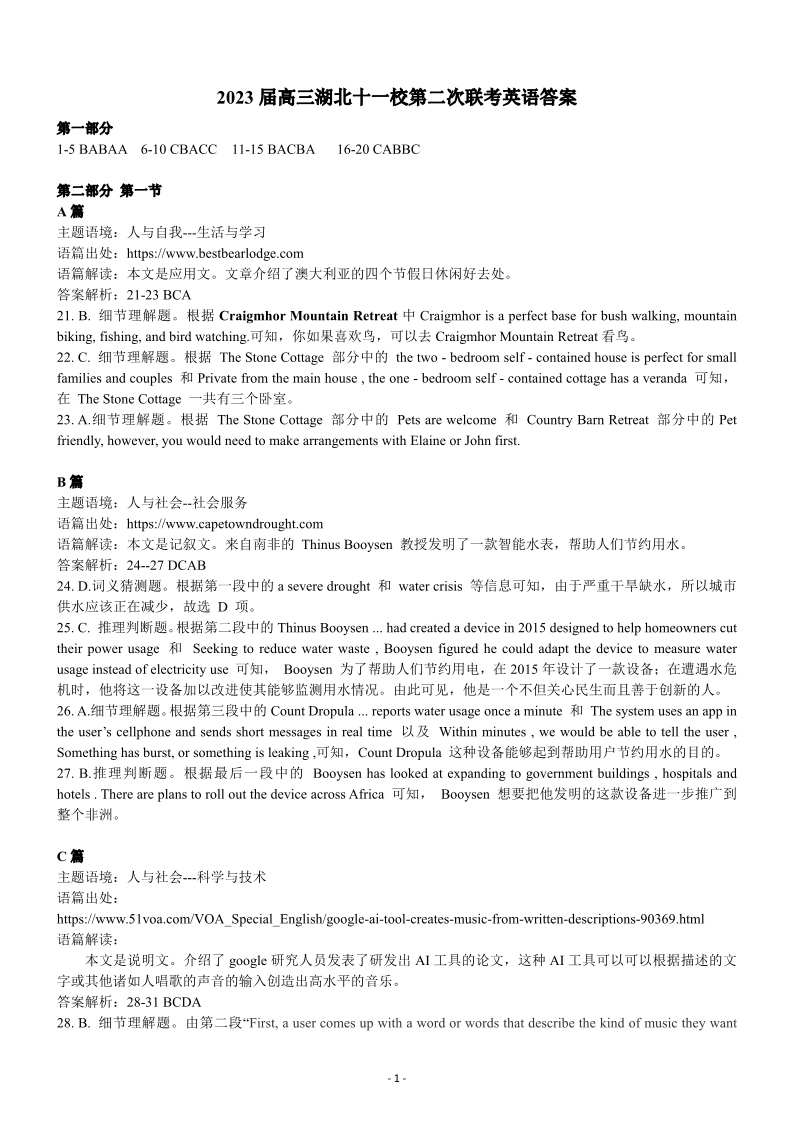 2023届高三十一校第二次联考 英语答案