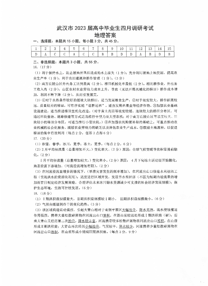 武汉市2023届高中毕业生四月调研考试+地理答案