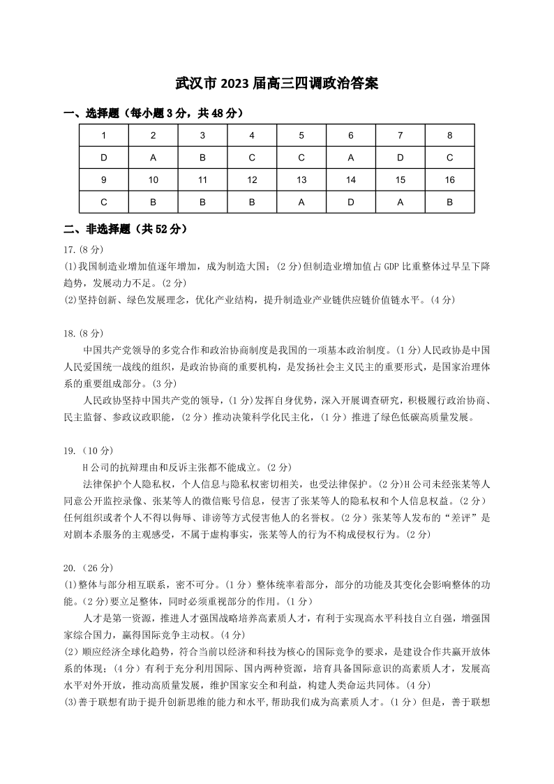 武汉市2023届高中毕业生四月调研考试+政治答案