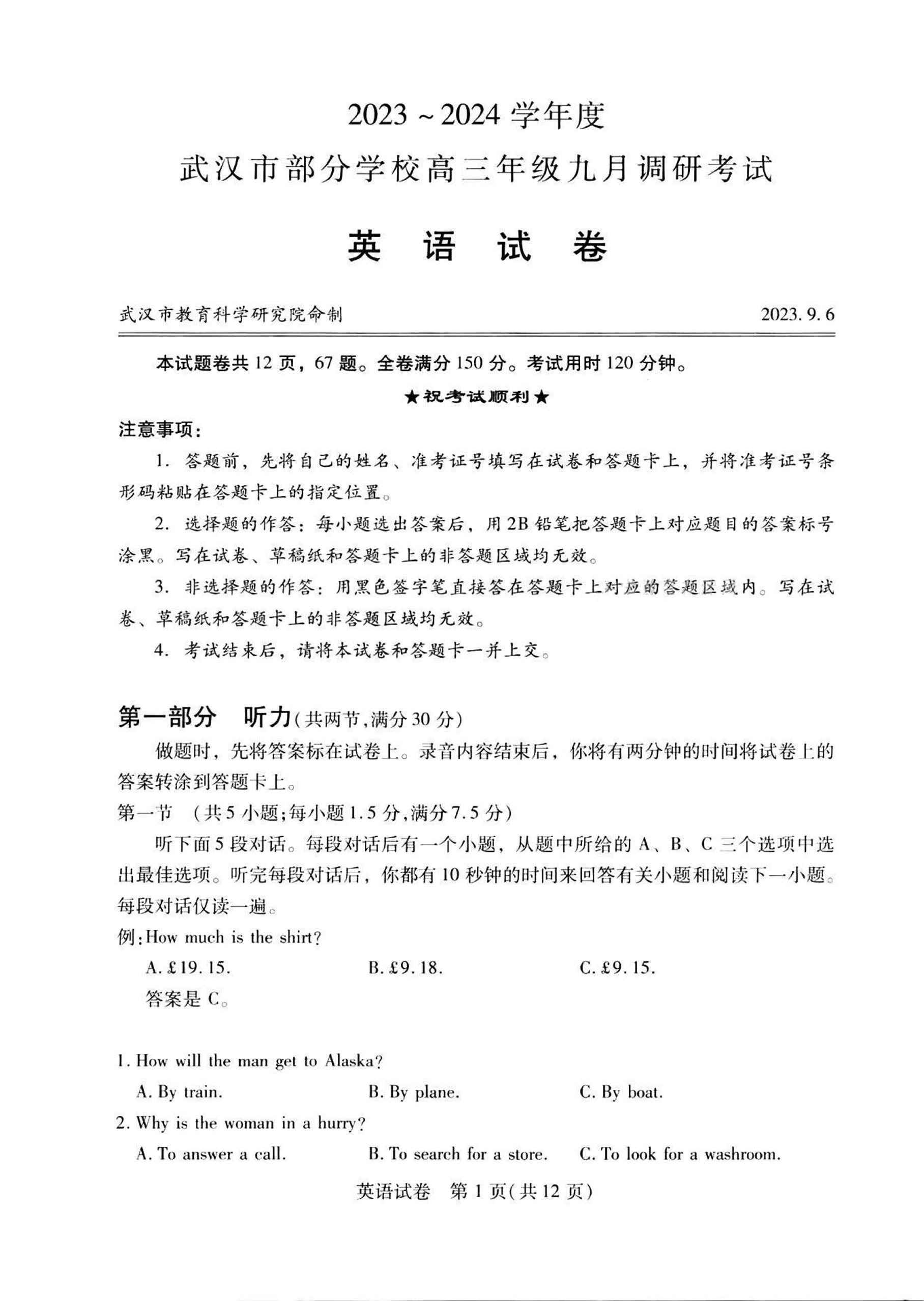 湖北省武汉市2024届部分学校高三年级九月调研考试+英语